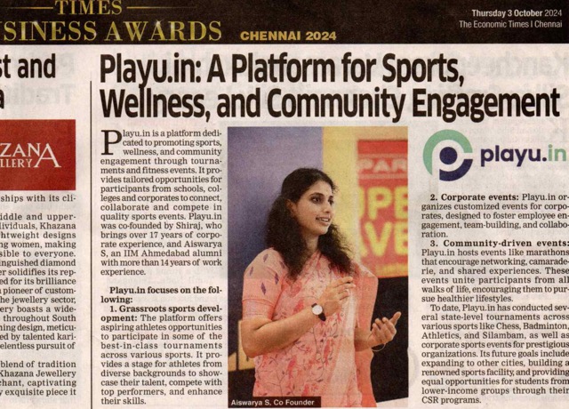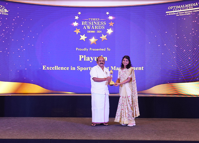 Playu.in received the Times Business Award for Excellence in Sports Event Management in Sep 2024. The award was presented to playu.in by Mr.T.M.Anbarasan, Minister for MSME and Tamil Nadu Urban Habitation Development Board.
